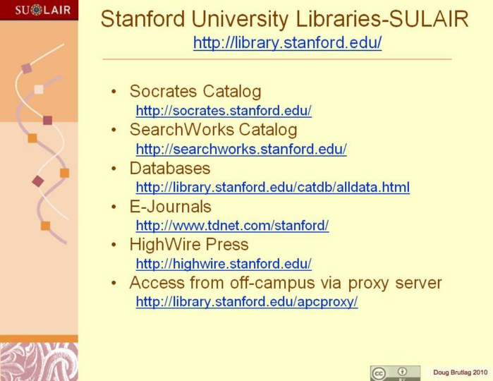 URL links from the slide: Socrates Catalog SearchWorks Catalog http://searchworks.stanford.edu/ Databases http://library.stanford.edu/catdb/alldata.html E-Journals http://www.tdnet.com/stanford/ HighWire Press Access from off-campus via proxy server http://library.stanford.edu/apcproxy/