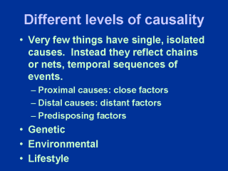 (normal range). Three main classes or dimensions of cause are popularly grouped under the following headings: Genetic: all and any heritable factors associated with a disease Environment: all and any non-heritable factors, particularly those related to physical and/or internal physiological environment. Lifestyle: the exposure history of a person or activities, habits, and locations that constitute their sequence of lived environments and acts. This is dependent upon a person’s location, acts, and interactions. These three groups constitute the majority of popular “explanations” for why disease occurs where and when it does. This disease is due to “faulty genes”, that disease is due to “environmental influences”, another disease is due to “lifestyle factors”, and so on. However, “explanations are not causes, but everywhere they are treated as if they were”. (quote, source unknown). However, there are some clearer and more specific criteria for determining if a agent is causally connected to an effect we label a disease. |