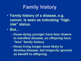 their sons will have “a family history” of prostate cancer. If you have a family history, you are considered to be at greater risk of the disease because it is assumed there is a genetic basis- (which of course there is to every disease). However, no family history records the positive, advantageous aspects of the grandfather’s phenotype. That of longevity (genes+environment+lifestyle), or survival genes (genes+environment+lifestyle), or others (genes+environment+lifestyle). So the record is of undesirable, but not of desirable traits. Is this an argument for more precise genetic profiling? No, because, while there will be some factors which relate to genotype, the penetrance of the genes varies so much as a result of other genes, environment and lifestyle influences that the most common conditions, those that take the bulk of medical time and expense, will be indistinguishable without considering all the environmental issues, and trying to track those down in combination with the range of normal genetic diversity will make deciphering the genome like learning the 2 times table in comparison to the task that is involved. The benefits are unlikely to justify the effort involved. |
