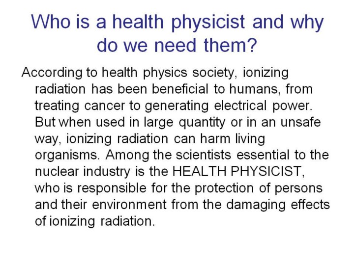 While health physics is now one of the required phases in the training of industrial hygienists who concern themselves with industrial and environmental hazards of all kinds, the Health Physicist is concerned entirely with problems created by radiation. Care must be taken with nuclear reactors, nuclear weapons, high-energy particle accelerators, x-ray machines, and radionuclides used in biomedical research and therapy. This special attention helps minimize the potential for unnecessary irradiation of individuals or environmental contamination. |