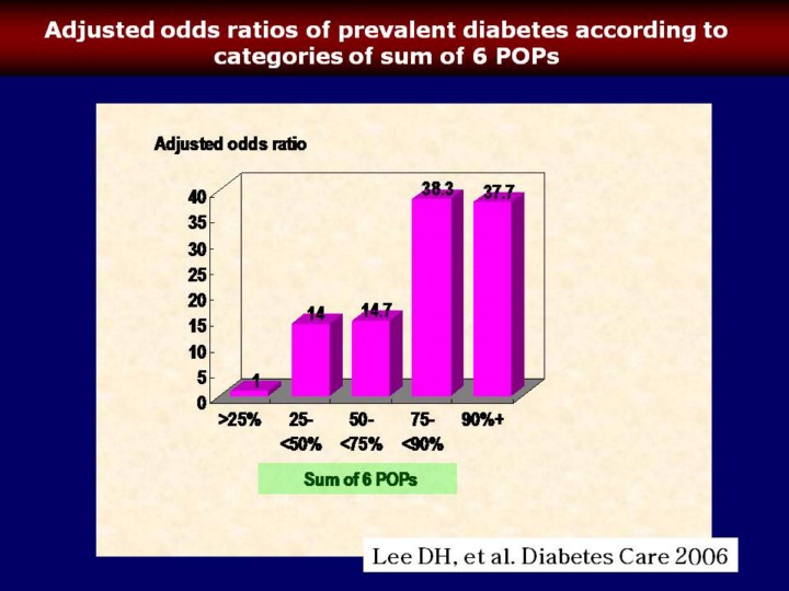 But when she summed up 6 pops, the summed up level showed statistically significant association with diabetes prevalence. The higher POPs level, prevalence increased. |