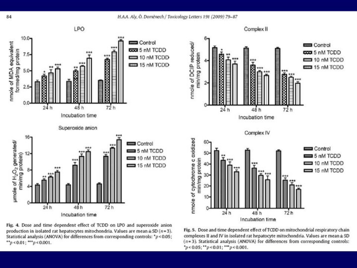 Simple PubMed searches are enough to bring evidences. This figure is just one of those thousands…This paper shows TCDD or dioxin cause time and dose dependent decrease in mitochondrial function, measured as complex 2 and 4 activities..In the left side of panel, you can see there is increase in free radical production as mitochondrial function decreases. |