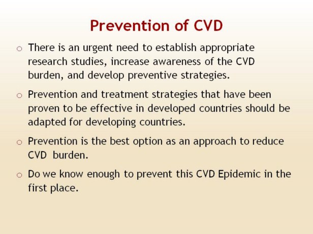 Validated nationally representative estimates of cause specific mortality are not available for any country in South Asia Therefore, there is an urgent need to establish appropriate research studies, increase awareness of the CVD burden, and develop preventive strategies in developing countries. In the meantime, as it is likely that most risk factors will be of some importance in all ethnic populations in the world, prevention and treatment strategies that have been proven to be effective in developed countries should be adapted for developing countriesb Establishment of surveillance systems for noncommunicable diseases and their risk factors is essential for developing prevention strategies and monitoring the impact of control programmes. Pilot programmes are now under way in some of the countries to establish and evaluate such systems. |