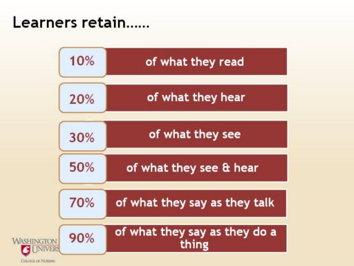 In addition to learning predominately through what we see, having students do return demonstrations (for example, role play and simulations) enhance the student’s retention of what they are learning. (Socony-Vacuum Oil Co. Studies, U.S. Department of Health Education & Welfare, 1994). |