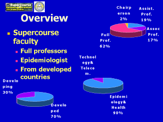 Supercourse lectures are provided by University professors. There are two major groups in Supercourse faculty. One is the Epidemiologist group either at school of medicine or public health, and the other is IT expert group either at university or at IT industry. About 70% of faculty members are from developed countries. |