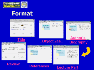 Supercourse lecture format: Each lecture has title page, objective page, author information page, then lectures pages, it’s usually 25 pages of lectures. At the end of each lecture, there are reference page and review page. |