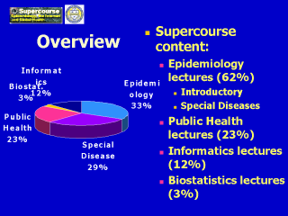 | Supercourse lectures are mostly about Epidemiology and public health. Also there are some medical/ health informatics lectures and Biostatistics lectures. |