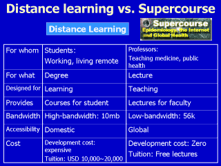 different from a traditional distance learning model. Most of distance learning program in the US is for the students who work during daytime and live in their hometown but want to have further education in a better school and to get a degree. Versus, Supercourse is designed to support professors in higher education who teach medicine or public health. Supercourse lectures can be used by students but it’s not a degree program. Distance learning usually requires highbandwidth network equipment, but Supercourse requires low bandwidth minimum hardware/software equipments. Distance learning is quite domestic. Most of programs are designed for domestic student not for international students. Supercourse is designed for global utilization. The content is also in a global health perspective. Most importantly, distance learning is very expensive to develop. Tuition fee is also very high. Supercourse is self-sustainable with very low budget. The lectures are for free of charge too. |