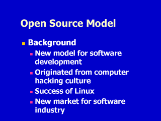 Source model? Open source concept came from software development history. It is originated from program hacking culture. Unlike crackers, who destroys a system, hackers steal secrete program code and open it on the Internet. Then the code is used among programmers and helps them develop better software. Linus Tovalds gathered these kind of open code of Unix here and there and created a small version of Unix, that is Linux. Then he opened the source code on the Internet. Linux was used by many other programmers. When they found problems or bugs, they shared the information openly. So the Linux program became more stable and robust. Finally Linux created a whole new market for open source software. Linux as an operating system and Apache as a web server program are well known open source software. |