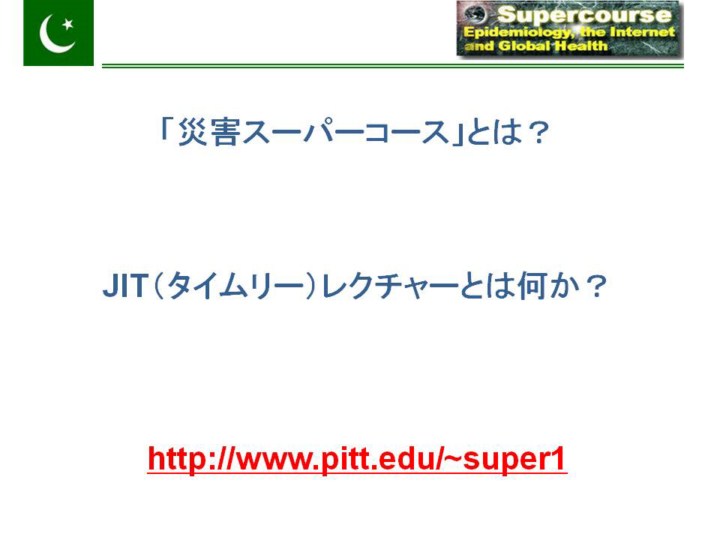 Just-in-time lecture(タイムリーレクチャー): JITタイムリーレクチャーは、世界中で大規模災害が発生した場合に作られる災害スーパーコースの一環です。この最新の教育資料の狙いは、知識の提供により、恐怖心を和らげ、人命を救うことにあります。災害の現場に向け、CNNの報道のようなパワーポイントスライドで、災害に関し、科学的な情報と疫学情報を提供します。 |