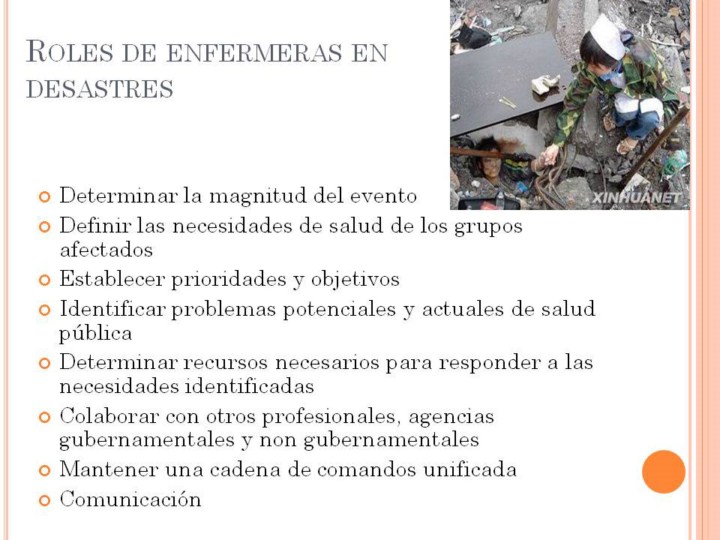 Currículo de enfermería, iniciando equipo de enfermeras del primer año con herramientas clínicas para evaluar, planear, implementar y evaluar las necesidades de salud de individuos y grupos. Están también entrenadas para trabajar en el contexto de equipo de trabajo. Esta fuerza de trabajo deberá capacitarse para manejo de desastres integrarse en el equipo de emergencias de cada país. |