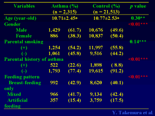 Table 2 shows the comparison between subjects with asthma and controls according to age, gender, parental smoking, parental history of asthma, and feeding patterns. Subjects with asthma were found more likely to be male, to have a parental history of asthma, and to have been breast-fed. No difference in parental smoking status was observed between subjects with asthma and controls.