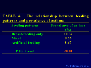 Table 4 indicates that the prevalence of asthma increased with the increase of the effect of breast-feeding significantly.