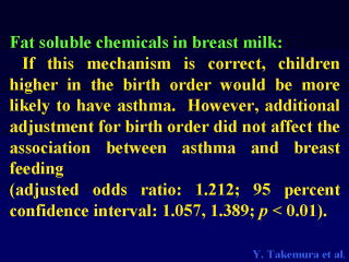 One hypothesis is that fat soluble chemicals accumulating in breast milk might induce asthma. If this mechanism is correct, children higher in the birth order would be more likely to have asthma. However, additional adjustment for birth order did not affect the association between asthma and breast feeding (adjusted odds ratio: 1.212; 95 percent confidence interval: 1.057, 1.389; p < 0.01). This indicates that this hypothesis is not supported. |