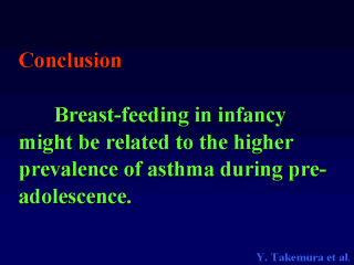 In conclusion, breast-feeding in infancy might be related to the higher prevalence of asthma during pre-adolescence. Although an epidemiological study such as this cannot provide definitive evidence of the risk of breast-feeding on the prevalence of asthma, our findings show the possibility of its undesirable effect.