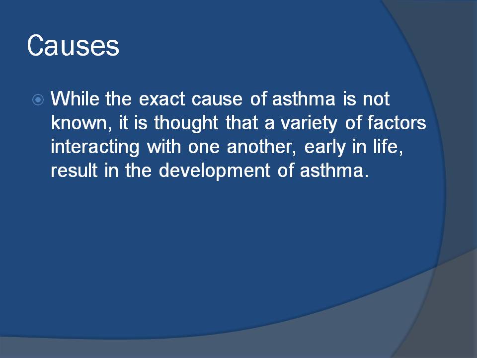 Asthma is not caused by any one thing, but by a variety of factors interacting with one another. One person’s asthmatic factors may be completely different than another person’s. |