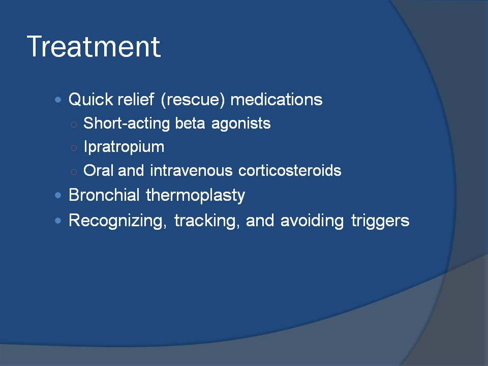Short-acting beta agonists – rapidly ease symptoms during an asthma attack. Acts within minutes and can last up to several hours. Ipratropium – relaxes the airways, making it easier to breathe. Oral and intravenous corticosteroids – relieve airway inflammation caused by severe asthma. Can cause serious side effects when used long term, so they're used only on a short-term basis to treat symptoms.