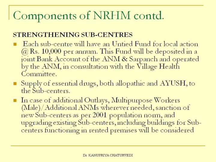 Peripheral most unit available at the Village level to take care of the Health needs of the community. A Health Sub centre covers a population of 5000 in plain areas and 3000 in Hilly and difficult terrains. All Primary Health Care Services are being provided at the door steps of the community Each Health sub centre is manned by a pair of Health Workers.