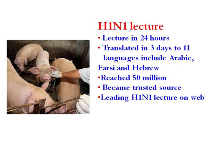 Our H1N1 lecture was a remarkable achievement as within 3 days we were able to teach 50 million people in 11 languages about H1N1. http://www.pitt.edu/~super1/lecture/lec34601/index.htm – original lecture at Supercourse |
