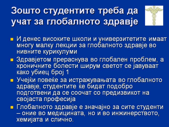 Оваа лекција беше првенствено дизајнирана за академскиот персонал и за студентите на медицинските факултети и школи за јавно здравје ширум светот. Меѓутоа, ние сметаме дека студентите и предавачите во сите дисциплини треба да учат за глобалното здравје со оглед дека тоа не зафаќа сите нас.