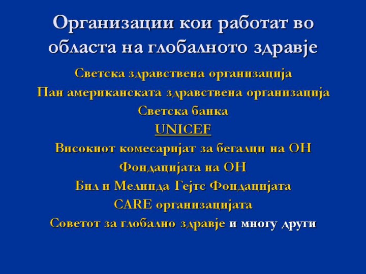 Како што беше напомнато во претходните секции, има многу значајни мултилатерални организации, фондации и невладини организации кои работат или се фокусирани кон глобалното здравје, како што се: