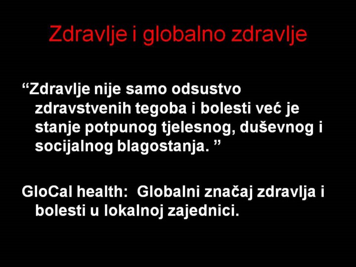 Da bi popravili zdravlje u svijetu mi trebamo “GloCal” koji je usmjeren od globalnog prema lokalnom. Pacijent koji sjedi ispred nas nije pogođen faktorima njegovog/ njenog lokalnog okoliša nego i njegovim/ njenim faktorima lokalne zajednice, zemlje i svijeta. Nužno je da mislimo globalno kad su u pitanju naši pacijenti. |