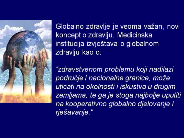 Međutim, nije to samo zdravstveni problem koji prelazi granice ili je zajednički u različitim zemljama širom svijeta; rješenja tog problema prelaze granice i traže učešće, ovisno o nivou razvoja. Sve zemlje mogu istovremeno učiti jedna od druge i istovremeno podijeliti svoja vlastita iskustva i informacije. Osvijetljena nova definicija o globalnom zdravlju predstavlja sliku s dva puta: podijeljen problem, podijeljeno rješenje. Nova definicija je vrlo važna za proučavanje globalnog zdravlja, tako da se globalno zdravlje može opisati kao put učestvovanja. Postoji mnogo izazova u globalnom zdravlju sa različitim profesionalnim isticanjima značaja različitih bolesti. Interdiciplinarni pristup je nužan da olakša teret zaraznih i nezaraznih bolesti. Trenutno, medicinske škole, visokoškolske ustanove i fakulteti u kurikulumu imaju malo nastavnih predavanja o globalnom zdravlju. Zdravlje postaje globalni problem, a sa hroničnim bolestima predstavlja ubicu broj jedan u cijelom svijetu. Učeći više o istraživanjima u području globalnog zdravlja, fakulteti i studenti medicine će se opremiti licem izazova ove jedinstvene profesije.