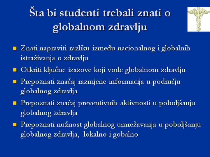 Globalno zdravlje kao važan koncept kojeg studenti moraju razumjeti. Globalno zdravlje nije jednostavan zdravstveni problem kao što su malaria, TB, ili AIDs, niti konstatacija kako je problem ozbiljan. Globalno zdravlje nije zdravlje jedne zemlje ili regiona. Globalno zdravlje prelazi granice i regione, pridružujući sve faktore koji su sadržani i determinišu naše zdravlje. Globalno zdravlje je svugdje-u tvojim klinikama, u tvojoj lokalnoj zajednici, kao i u tvojim zemljama (svijetu)
