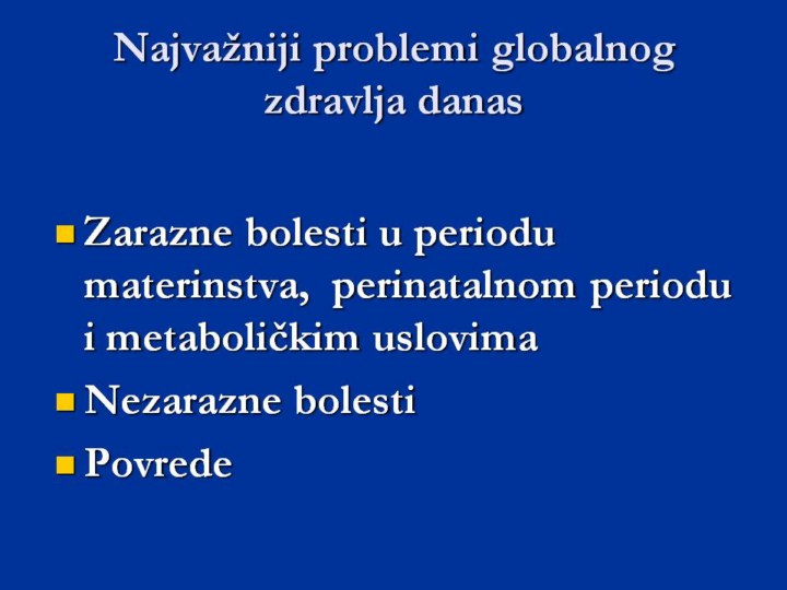 Koji su najvažniji problemi globalnog zdravlja današnjice? Temeljna publikacija 1996. godine, “Globalno opterećenje bolestima”, predstavljano činjenicama u projekciji u periodu od 1990. godine i biće nastavljeno do 2020. godine za tri najučestalije uzroke zdravstvenih problema, a koje zajedno čine ukupno svjetsko opterećenje bolestima. To su: 1 skupina, zarazne bolesti u periodu materinstva, perinatalnom periodu i metaboličkim uslovima; Skupina 2, nezarazne bolesti; i Skupina 3, povrede. Svaka od ovih širokih skupina ima više specifičnih uslova.