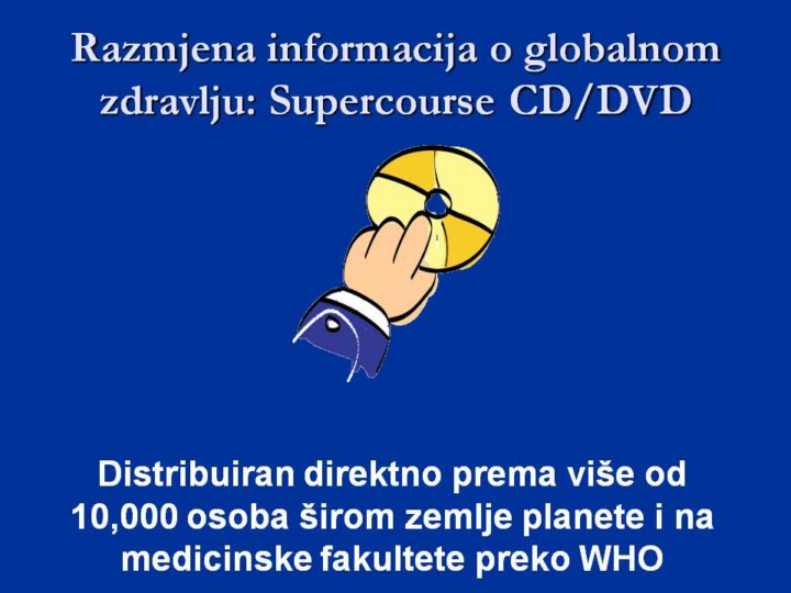 Supercourse CDs je dar onome ko ga prima i spozna njegov značaj. Slobodan Supercourse DVD-i se može dodijeliti skupini od 5 studenata ili biblioteci.