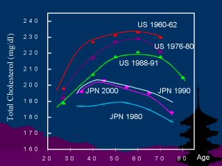 serum total cholesterol in the USA and Japan In the US, the levels of serum total cholesterol declined in every age group from 1960-62 to 1988-91. In Japan, the levels of serum total cholesterol increased in very age group between 1980 and 1990. The levels remain similar between 1990 and 2000. It is very interesting that the levels of serum cholesterol in young generations in the US and Japan are similar in 1990. In middle and older age groups, there are still substantial differences in levels of total cholesterol between the US and Japan. In addition, the difference in the levels of cholesterol in these generations were much wider in the past, which is attributed to the huge difference in age-adjusted CHD mortality between the US and Japan to great extent. Source: NHANES and National Cardiovascular Survey of Japan. |
