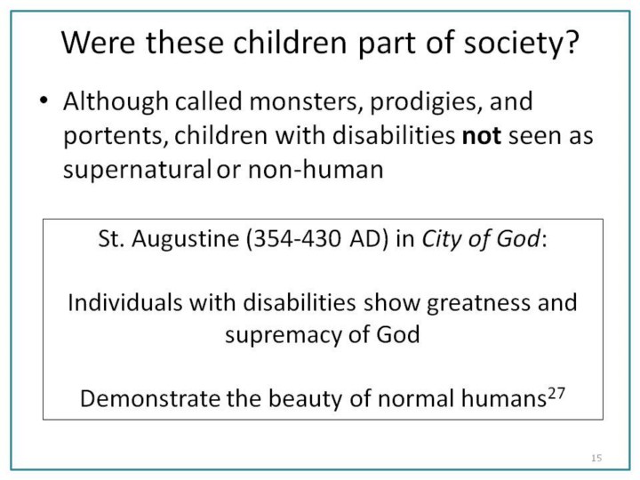 The interpretations and actions of ancient societies did not accept infants with deformities into society. If a child survived into adulthood, he or she would often be treated with fear or suspicion. Despite these actions, these individuals were not considered to be non-human or supernatural. They were generally considered to belong in the human family. When St. Augustine addressed the subject in City of God, he stated that abnormal infants were human and created by God. Their purpose, he states, is to demonstrate the greatness of God and the beauty of normal human beings.28 St. Augustine did not promote more humane care, but his argument placed these frightening infants in the spectrum of the natural world. |