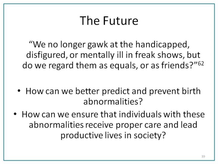A noteworthy change in reaction to abnormal individuals has been to view them as members of society rather than outcasts to be studied or exhibited. This has undoubtedly helped children live more normal lives. However, as Y. Edward Hsia said to a conference on birth defects, “We no longer gawk at the handicapped, disfigured, or mentally ill in freak shows, but do we regard them as equals, or as friends?”63 This inclusionary view seems strongly dependent on society’s emphasis on individuality and freedom. These changes, along with medical and legal advances, shape how our society understands infants with birth defects.