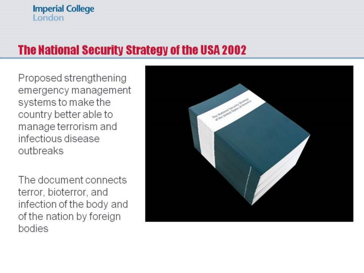 The second consequence of the anthrax attacks has been a strengthening of the US emergency management systems: The National Security Strategy of the USA of Sept 2002 stated that strengthening these emergency management systems would not only make the country better able to manage terrorism, but also all infectious disease outbreaks and mass casualty dangers. The border control would stop not only terrorists but improve efficient movement of legitimate traffic – i.e. the document connects terror, bioterror, infection of the body and of the nation by foreign bodies. Although there is an intensified exchange of pathogenic organisms along the path of migration, this exchange is more pronounced in the global tourist traffic. Yet here illegal immigration and the threat from infectious disease seem on the same level as terror and bioterror (Sarasin 2006).
