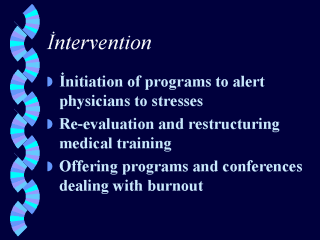 with effective ways to cope with stress and burnout. Postgraduate medical training must also be re-evaluated and restructured to prevent burnout. Better working conditions must be given to house officers. Medical societies must offer programs and conferences to help senior physicians. Such porgrams might be valuable to teach physician that asking for help is acceptable for them (3). |
