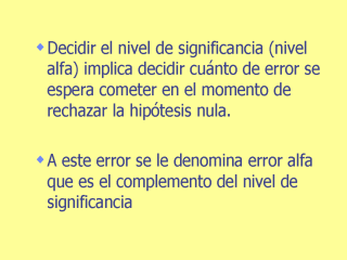 Un nivel alfa de 0.05, indica que de cada 100 veces que se realice el estudio en 5 oportunidades la hipótesis nula debe ser verdadera. Un incorrecto rechazo de la hipótesis nula se conoce como error tipo I o