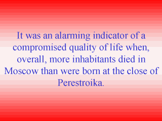 | Moscow and St. Petersburg had the highest life expectancies in the Russian Federation, in 1978-1979, which decreased for men by 6.6 years in Moscow and 5.2 years in St. Petersburg by 1994. A 20% sample of permanent male residents of the 1916-1935 birth cohort from Moscow and St. Petersburg has shown that individual survival was the lowest among the least educated in 1990-1994, as compared to the higher educated, who exhibited the best survival rates (Shkolnikov, 1996). |