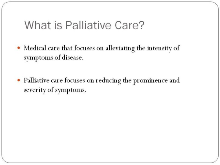 | Contrary to what is traditionally thought of as “treatment”, palliative care focuses on reducing the prominence and severity of symptoms rather than working to postpone or stop the spread of a disease.