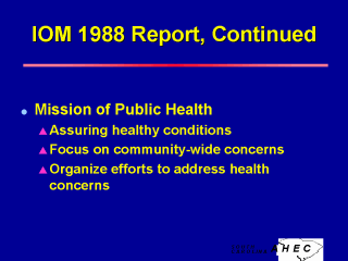 The Institute’s report defined the mission of public health as: “fulfilling society’s interest in assuring conditions in which people can be healthy. Public Health is distinguished from health care by its focus on community-wide concerns -- the public interest -- rather than the health interests of particular individuals or groups. It’s aim is to generate organized community effort to address public concerns about health by applying scientific and technical knowledge.” (IOM, 1988, p. 140) |
