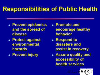 Responsibilities of Public Health Prevent epidemics and the spread of disease: This is the classic role of public health, although each time it is invoked there is a need to re-negotiate the balance between community protection, social justice and individual autonomy. Protect against environmental hazards: The limitation of hazardous exposure in the first place is one of the basic approaches of public health. Prevent injury: The application of Epidemiology to understanding risk factors and the causes of intended and unintended injuries has allowed organized programs to reduce traffic death and injury, occupational injury, food-borne epidemics and other injuries. Promote healthy behavior: Respecting the autonomy of individuals, it is appropriate to provide education, support and encouragement for for adoption of healthier decisions, actions and lifestyles. Respond to disasters and assist in recovery: Any disaster markedly increases public health risk by disrupting food, water, medical services and other support systems. Assure access to health services: This responsibility has become ever more important as the cost of personal care has risen and the numbers of uninsured and underinsured has increased. Every community should expect that these responsibilities are being fulfilled on a regular, reliable basis, by some combination of entities. |