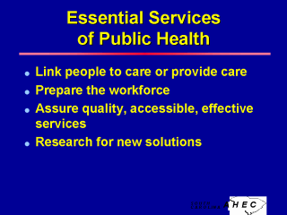 Link people to care or provide care: Some care is critical to public health, such as treatment for active tuberculosis, and so is often publicly provided. Other care services may be in the public sector by plan or default. Current trends are moving away from direct provision and emphasize developing access and assuring quality. Prepare the workforce: The public health system should be in a position to assure the public that all health workers (those giving personal care and population-focused services) are prepared for their responsibilities. Assure quality, accessible, effective services: This essential service is just beginning to get the attention it deserves from all components of the system. Research for new solutions: While biomedical and clinical research are well supported and funded, studies of both personal health services and the public health system are sorely needed to assure that improvements are appropriately made over time. |