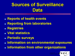 For rapid reporting, analysis and action, public health agencies need several types of information: - Reports of health events affecting individuals - Vital statistics on the entire population - Information on the health status, risk behaviors, and experiences of populations - Information on potential exposure to environmental agents - Information on existing public health programs - Information useful to public health, but obtained by organizations not directly involved in public health - Information on the health care system and the impact of the health care system on heatlh |
