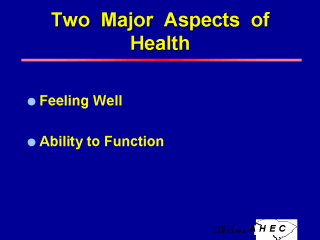 our own health 1) How we feel-Feeling well is related to our attitude as well as true measures of health. As the saying goes “it is all relative”. In other words, individual perceptions of pain and limitations vary widely person to person. People who feel well and have a positive attitude are more likely to actually be healthy as well. 2) Ability to function-The ability to carry out minimal requirements for independent living can be another parameter for defining our health. It may be difficult to feel healthy when we cannot function independently. However, once again, there are many cases of individuals learning to adapt to disabilities and functioning very well over time. |