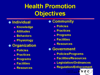Multilevel Health Promotion Targets of health promotion are not just the individual with the health problem but also those who can set policy or health and education professionals because they can foster the adoption of healthful changes in the environment, improve health services, and encourage healthful personal behavior change. Health promotion objectives can focus on several societal