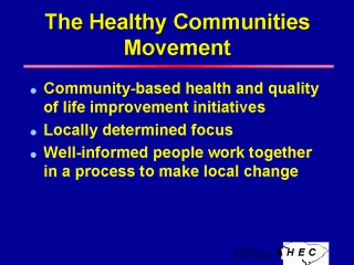 The Healthy Communities movement is an international effort aimed at improving the quality of life in communities around the world. It was born of the realization that health care organizations had not and could not effectively identify and address community needs, and that committed citizen groups could accomplish what government could not. Origin South Carolina: SC DHEC |