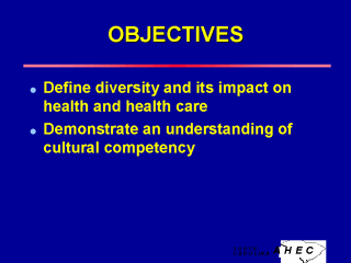 Objectives: At the conclusion of this module the learner will be able to: - Define diversity and its impact on health and health care - Demonstrate an understanding of cultural competency Student Reading: Carrillo JE, Green AR, and Betencourt JR: Cross-Cultural Primary Care: A Patient-Based Approach. Annals of Internal Medicine, 1999;130:829-834. Tirsdo, M.D. Knowledge, Skills, and Abilities Essential to Cultural Competence. In: Tools for Monitoring Cultural Competence in Health Care. San Francisco, CA: Latino Coalition for a Healthy California. 1996. Auger, S and Colindres, M. Steps for Becoming Culturally Competent. In: Latino Cultural Competency Training Curriculum. Raleigh, NC: North Carolina Women’s Preventive Health Branch, Division of Maternal and Child Health, North Carolina Department of Environment, Health and Natural Resources. 1994. Sue, D.W. and Sue, D. Characteristics of the Culturally Skilled Employee. In: Counseling the Culturally Different: Theory and Practice. New York, NY: John Wiley and Sons. 1990. Cross T., et al. Guiding Principles of Culturally Competent Service Adaptations. In: Towards a Culturally Competent System of Care. Volume I: A Monograph on Effective Services for Minority Children Who Are Severely Emotionally Disturbed. Washington, DC: CASSP Technical Assistance Center, Georgetown University Child Development Center. 1989. |