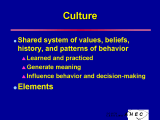 | Culture People with a shared system of values, beliefs, history, and learned patterns of behavior that: - Individuals learn and adhere to while participating in or out of groups they usually interact with - A group uses to generate meaning among its members - Influence behavior and decision-making Elements - Everyone has a culture - Culture reflects traditions having been passed down through generations. - Culture is not necessarily consciously expressed. - Culture drives a person’s beliefs and behaviors. - Culture is dynamic and changes over time. - People can belong to many different subcultures. |
