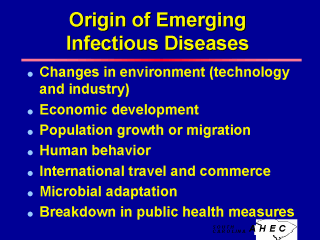The cause of almost all emerging infectious diseases can be traced to changes in environment (technology and industry), economic development and land use, human population growth or migration, human behavior, international travel and commerce, microbial adaptation, or a breakdown in public health measures. Under suitable circumstances, a new infection anywhere in the world could traverse entire continents within days or weeks. USDHHS (1998). Preventing Emerging Infectious Diseases: A Strategy for the 21st Century, Atlanta: Centers for Disease Control and Prevention. |