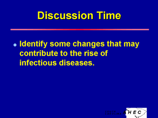 Answers may include the following modern demographic and environmental factors that favor the spread of infectious diseases: Environment (technology and industry ) International travel and commerce, global travel, globalization of the food supply and centralized processing of food; worldwide transport of animals and food products. Population growth and increased urbanization and crowding; poverty; population movements due to civil wars, famines, and other man-made or natural disasters; migration. Economic development and land use; irrigation, deforestation and reforestation projects that alter the habitats of disease carrying insects and animals. Microbial adaptation:development of resistance to newly emerging microbes. Human behaviors, such as IV drug use and risky sexual behavior; increased use of antimicrobial agents and pesticides, hastening the development of resistance; and increased human contact with tropical forests and other wilderness habitats that are reservoirs for insects and animals that harbor unknown infectious agents; increasing numbers of persons with impaired host defenses. USDHHS (1998), Preventing Emerging Infectious Diseases: A Strategy for the 21st Century, Atlanta: Centers for Disease Control and Prevention. |