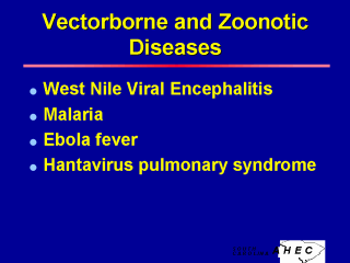- Cases of a West Nile-Like Viral Encephalitis first appeared in the US in 1999 in New York. This inflammation of the brain caused by viral and bacterial agents is transmitted by the bite of a mosquito infected with the West Nile virus. Mosquitoes become infected by feeding on birds infected with the virus and transmit the virus to humans and animals. The source of the US virus is unknown. Mortality rates range from 3% to 15%, with slightly higher rates among the elderly. - Malaria in humans is caused by one of four protozoan species that are transmitted by the bit of an infected female Anopheles mosquito. The estimated risk of a US traveler acquiring malaria varies markedly from area to area. From 1980 to 1992, 82 % of US malaria cases were acquired in Africa, 8% in Asia, and 5% in the Caribbean and South America. As mentioned previously, there is a world-wide problem with increasing resistance of malarial parasites to drug therapy. - Ebola virus is one of the deadliest viruses known and kills by causing high fever and severe bleeding (viral hemorrhagic fever). It emerges periodically from unknown, probably small animal, natural reservoirs, accidentally infects man, and causes dramatic self-terminating outbreaks. - Hantavirus is carried by rodents and in humans can cause severe pulmonary hemorrhage and death. It was first described during a 1993 outbreak in the southwestern US. USDHHS (1998), Preventing Emerging Infectious Diseases: A Strategy for the 21st Century, Atlanta: Centers for Disease Control and Prevention. USDHHS, Morbidity and Mortality Weekly Report, 47(RR-15), September 11, 1998, Atlanta: CDC. |